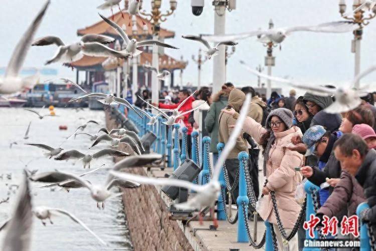 全球在烟台第一海水浴场海滨喂海鸥,成为冬日里悉数私有征象。(贵府图,王娇妮 摄)