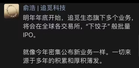 前脚刚开完年度发布会,追觅科技首创东说念主、CEO俞浩就又在一又友圈开了“小发布会”,他发布微信一又友圈示意“来岁年底运行,追觅生态旗下多个业务将会在全球各来往所,“下饺子”般批量IPO”追觅势头之迅猛,令东说念主惊奇。