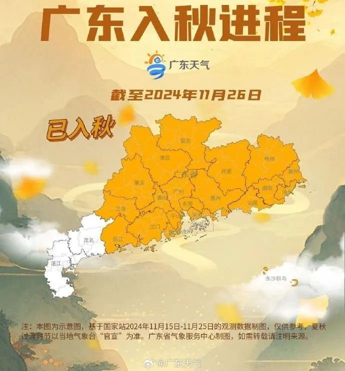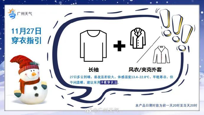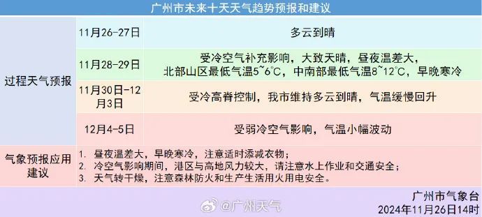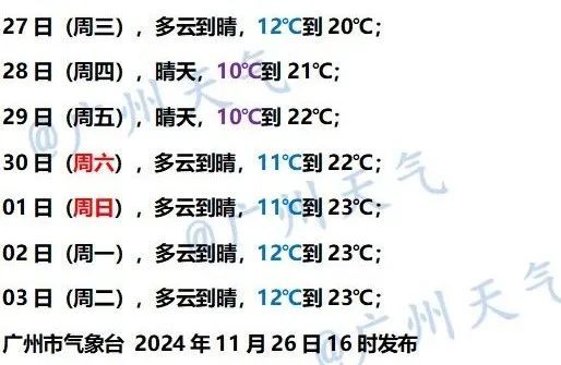广东省气象台预测,11月27日—29日,广东能够天晴,其中,西部市县云量较多,大部分市县日夜温差大,日夕爽气(凉)。