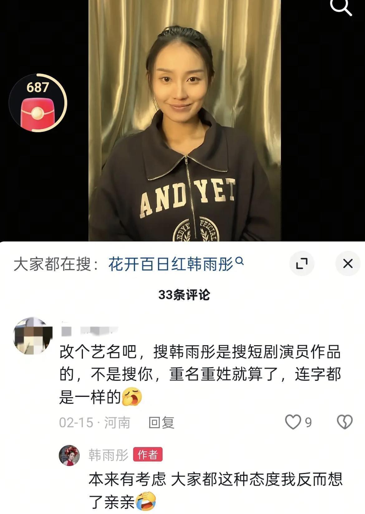 你再横向对比一下那些靠颜值撑着讲台词的同时短剧演员,上下立现。然后是阿谁“名字保卫战”。2026年头,有个叫韩雨彤的新东说念主演员,因为跟顶流撞了名,被顶流粉丝围着骂,让她更名。新东说念主回了句“看神思吧”,激化矛盾。这事儿里,顶流韩雨彤本东说念主一个字齐没发。
