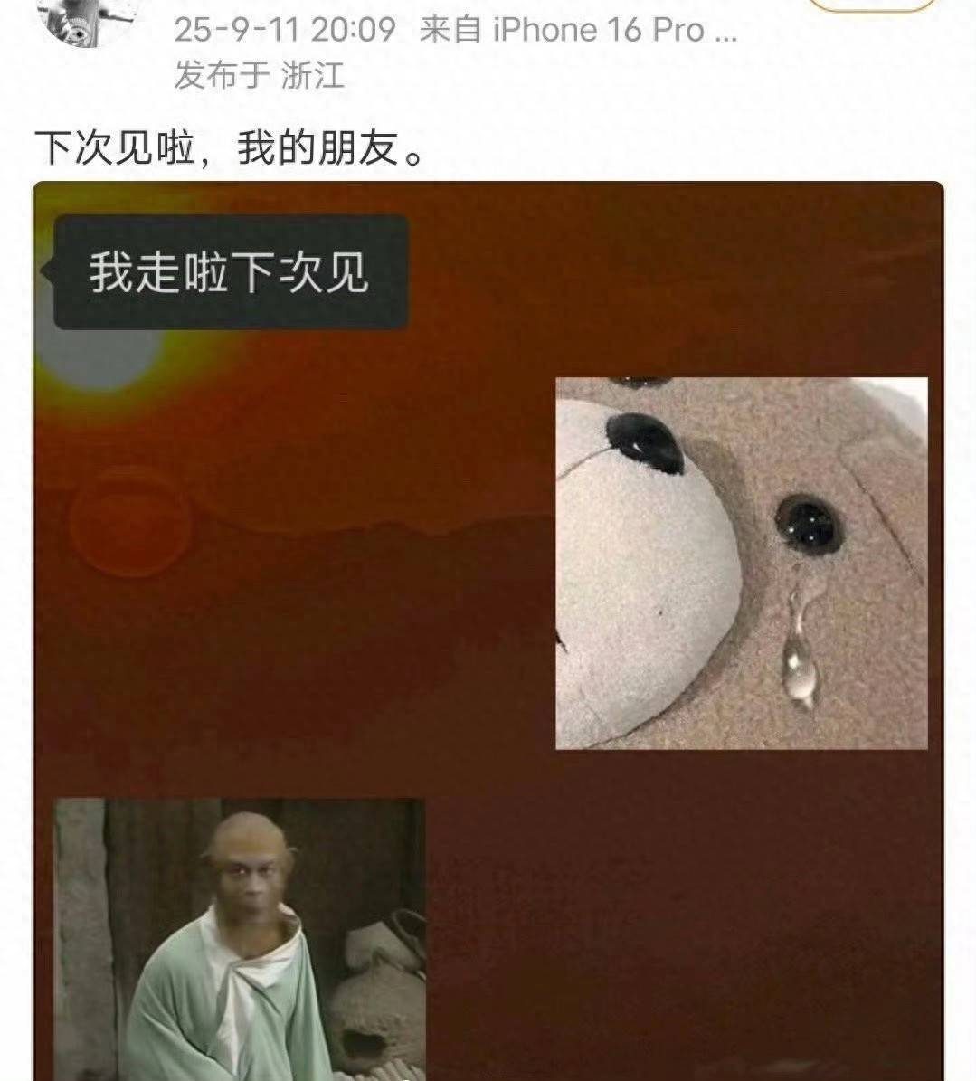 两位艺东谈主之间必定有着不为东谈主知的珍稀心情。概况是片步地作的通晓联接,概况是暗里采集的快乐时光,又或是彼此扶捏的关怀顷刻间。天然具体细节不知所以,但这句看似简便的告别,却承载着最贞洁的激情分量。