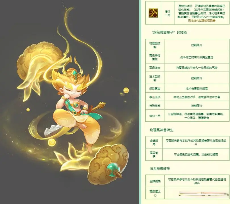 环球好,我是小三尊龙凯时(中国)官方网站,每天给环球共享游戏中的八卦趣事! 每年的12月18日是黑甜乡西游的生辰,这一天叫黑甜乡西游的嘉年华,黑甜乡西游在嘉年华前也会通达一些说合的步履玩法,在每次嘉年华步履中皆会上线一只新的神兽。在本周的堤防中嘉年华步履和嘉年华新神兽就仍是上线了。 本年的嘉年华新神兽的名字叫超等黄眉鸠拙,这是黑甜乡西游中的第一只领有着须弥真言极度手段的神兽。超等黄眉鸠拙领有的极度手段是凯旋出战时,将会取得绑定召唤兽以进化的手段,也即是超等黄眉鸠拙在参预搏斗的时辰,有可能会同期