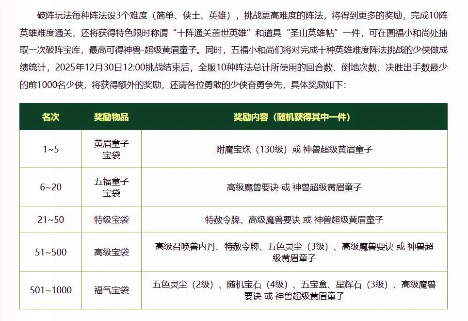 第3种取得的模式即是参与破阵玩法,破阵玩法的难度分为浅近,侠士和勇士。诸位玩家参与破阵玩法以后是不错进行名次的,按照所需回合数,倒地次数,决胜动手次数最少来进行名次,前1000名玩家皆不错取得罕见的奖励。在开启奖励给的宝袋的时辰皆有契机取得超等黄眉鸠拙。