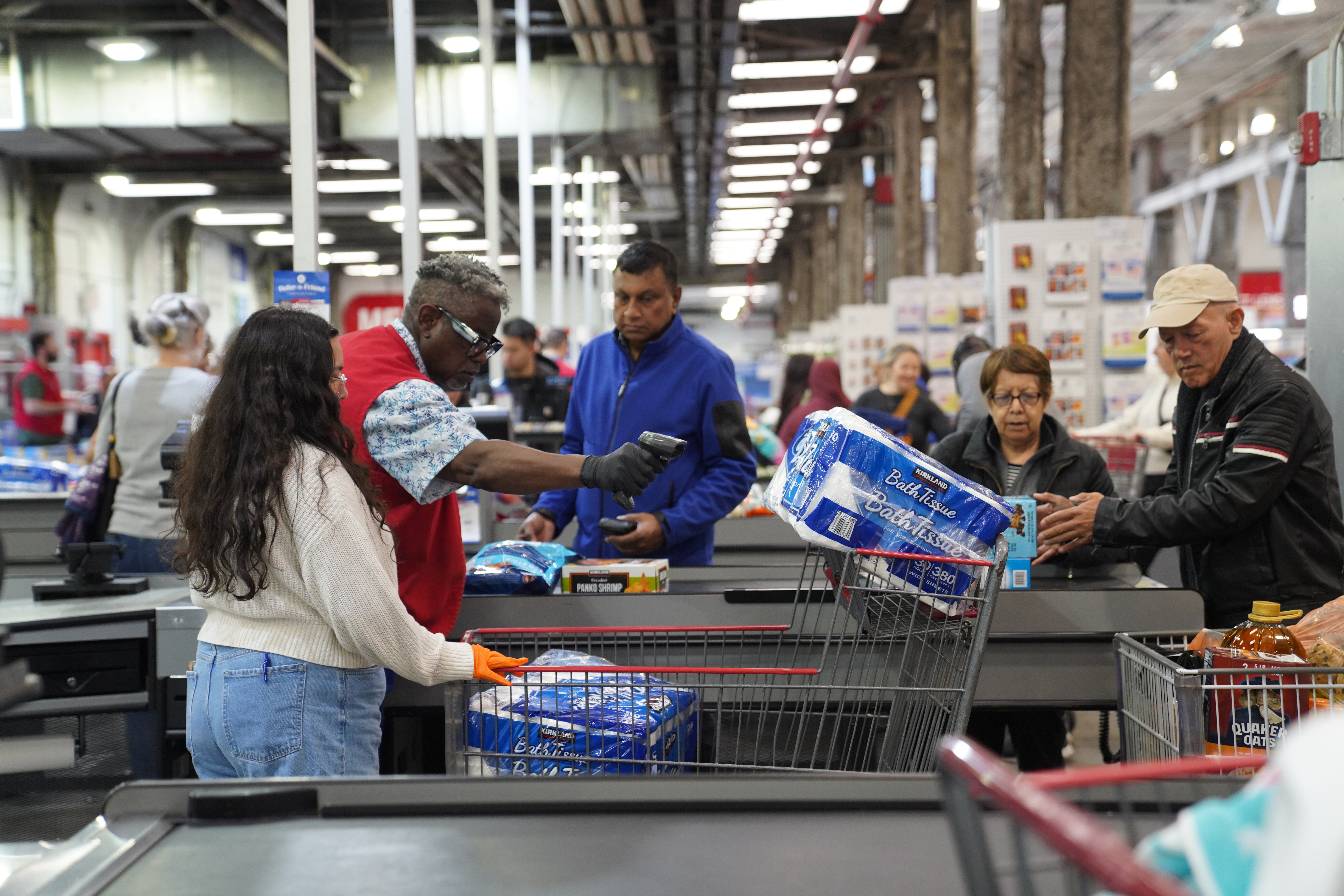 4月10日,东谈主们在好意思国纽约一家超市购买生存用品。